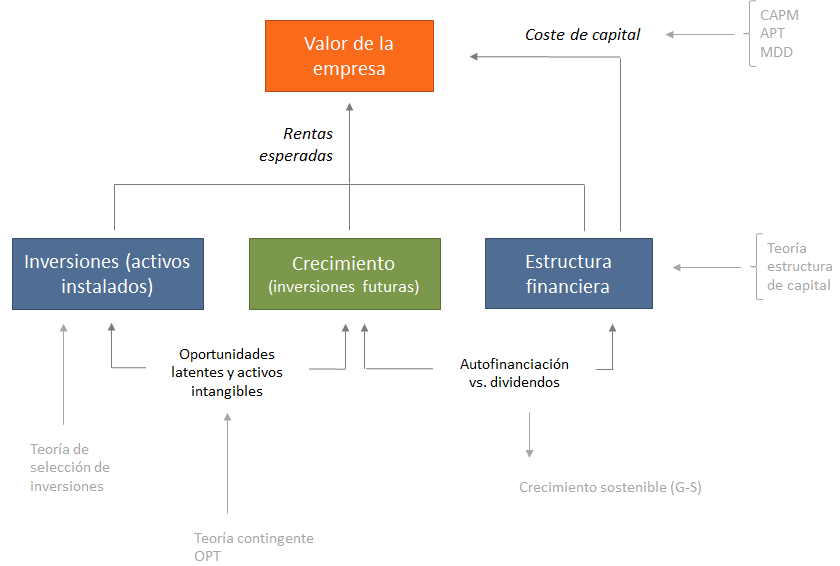 El esquema mostrado más abajo trata de sintetizar la estructura y las variables esenciales del problema, y sus conexiones con la teoría financiera. El valor es una síntesis de las rentas esperadas y del coste de capital; las primeras dependen de las inversiones actuales y futuras, así como de las cargas que se derivan de la estructura financiera. Tenemos varios modelos y teorías que explican la manera en que se forma el coste de capital, y la incidencia del riesgo sobre la rentabilidad exigida por los accionistas. Las rentas futuras dependen en gran medida del grado en que la empresa disponga de oportunidades y financiación adecuada para crecer; las teorías de la estructura de capital y de dividendos aportan la lógica necesaria para adoptar decisiones en este campo. La contribución de valor de las oportunidades que afectan al crecimiento (crecer, reducir, abandonar, aplazar, etc.) se evalúan empleando la teoría de activos contingentes, y en concreto modelos para la valoración de opciones reales.