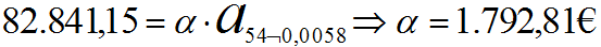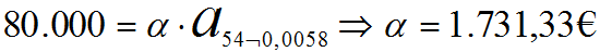 Si se hubiese concertado una carencia completa, el deudor no pagaría nada durante los seis primeros meses, de manera que ha deuda real se habría elevado hasta 80.000 · (1 + 0,0058)6 = 82.841,15€. Durantelos 54 meses siguientes pagaría una mensualidad de 1.792,81€: